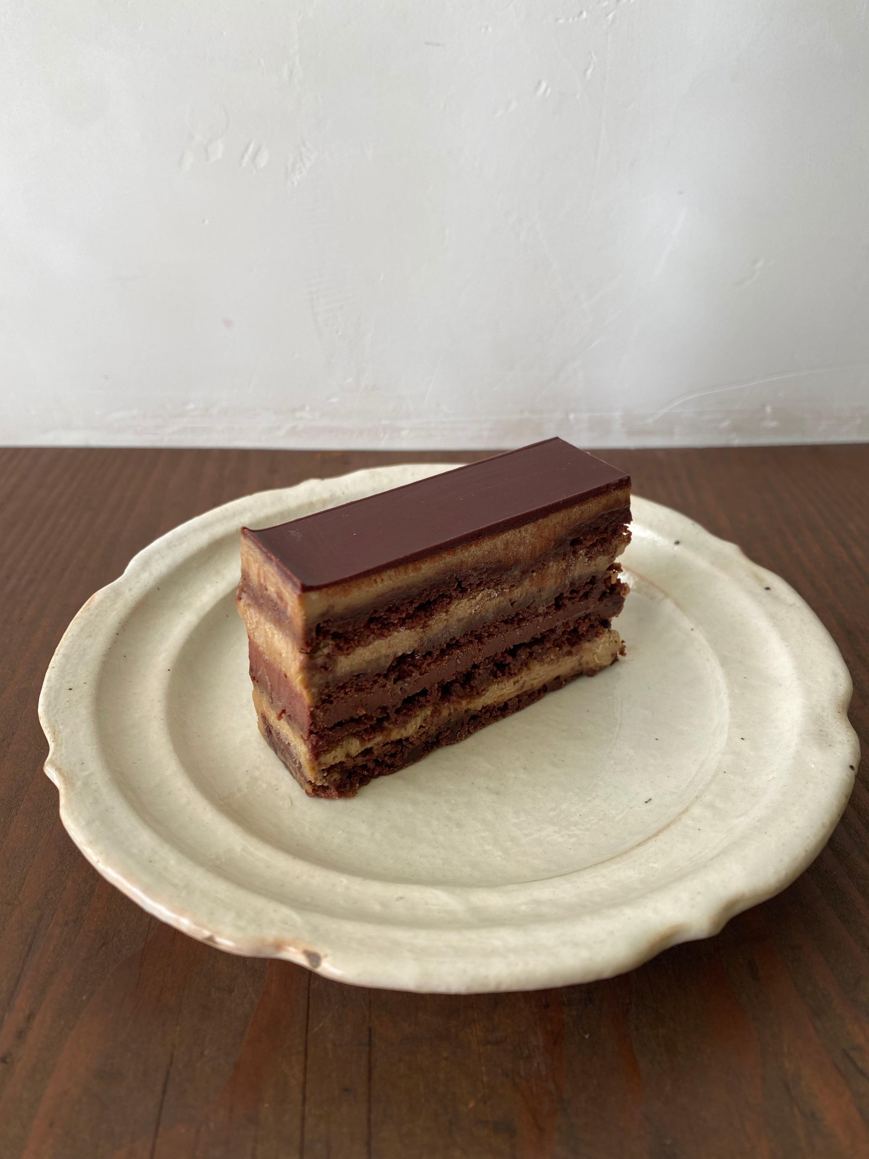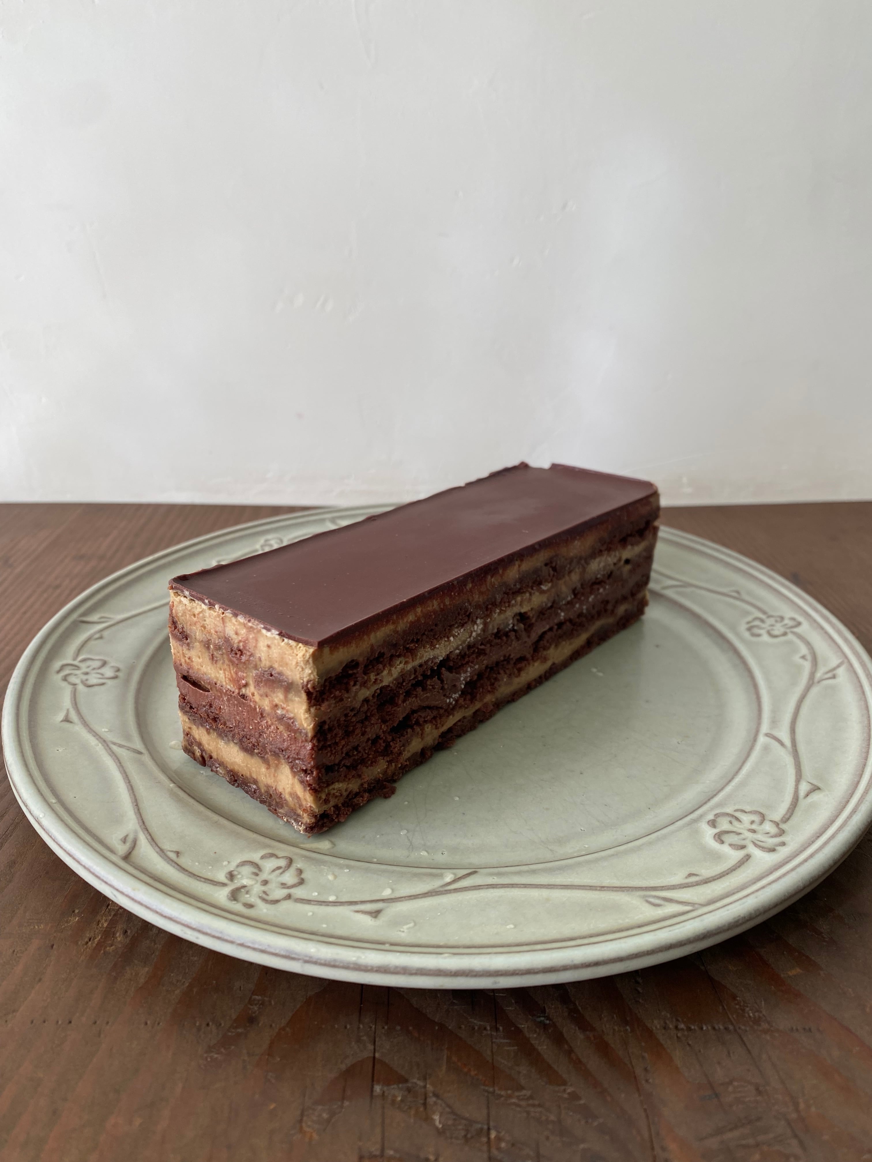 ビーントゥーバーのガナッシュ、チョコレート生地とカシューナッツと有機コーヒーをベースに作ったクリームを重ねたオペラ風のケーキです。